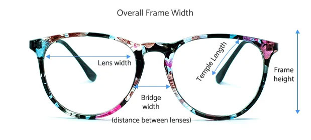 Lens Width/Diameter – The horizontal width of each lens in millimeters. It ranges between 40-62mm. Bridge Width – The distance between the two lenses in millimeters. It ranges between 12-24mm. Temple Length – The length from screw to temple tips. It ranges between 110-170mm.